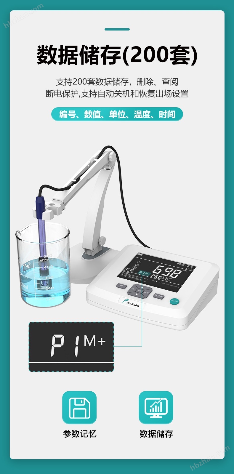 支持自动标定功能和自动识别 pH4.00、pH6.86、pH9.18 三种 pH 标准缓冲溶液。