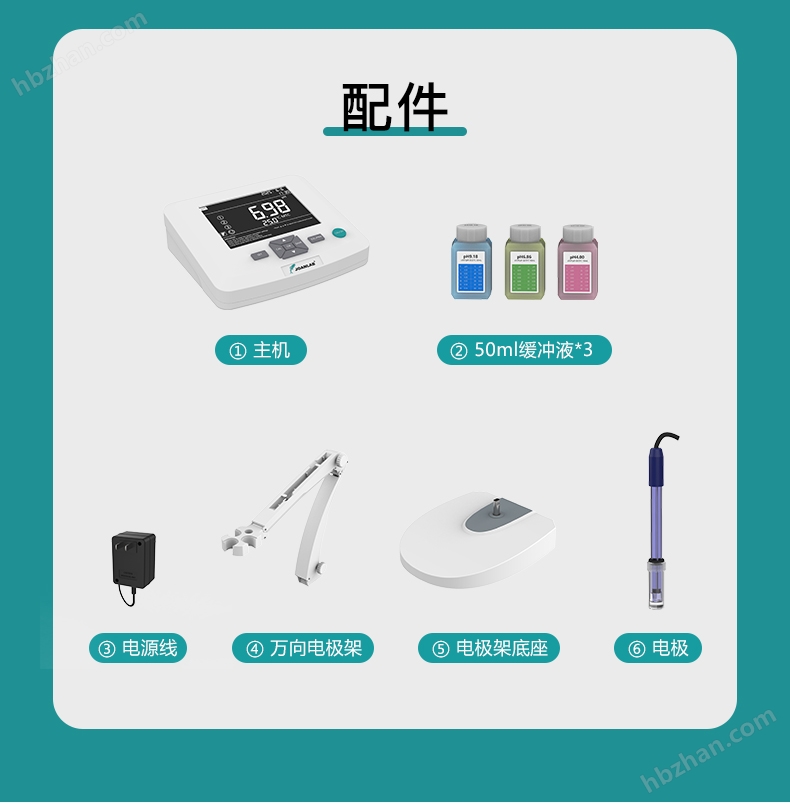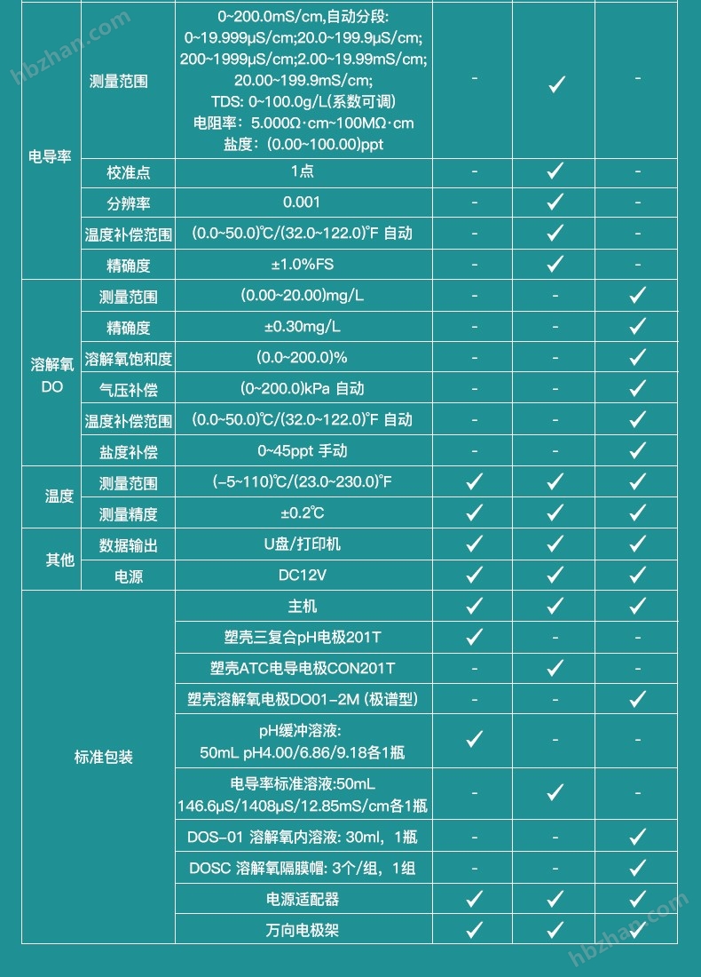 | 标准包装 | pH 缓冲溶液: 50mL pH4.00/6.86/9.18 各 1 瓶 | - | √ | - | - |